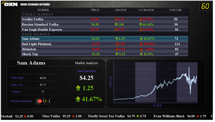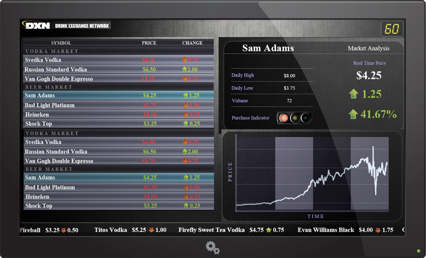 The Drink Exchange is the best beverage marketing tool in the industry. Sales for items listed in the Drink Exchange increase upwards of 500%. The reason is pretty simple, patrons want to participate in the Market and tend to only purchase from the Drink Exchange TV Display. Dynamic pricing is a powerful tool. Use this to your advantage by increasing sales for high profit margin items